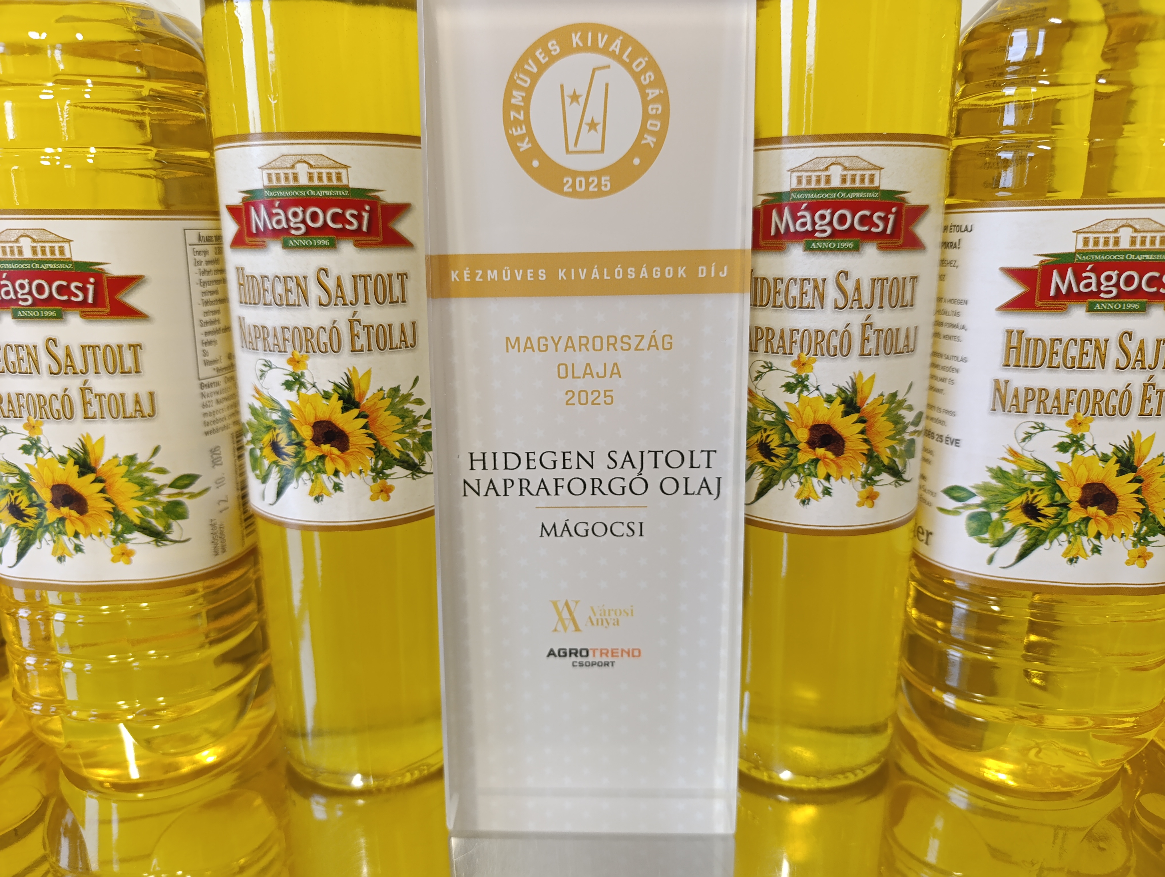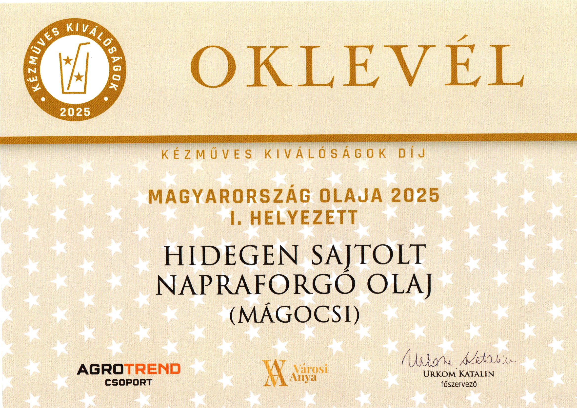 2025-ben mérettettük meg először olajainkat és büszkén mondhatjuk hogy olaj kategóriában a Kézműves Kiválóságok első díját kaptuk a Mágocsi Hidegen Sajtolt Napraforgó Olajunkkal, ezzel elnyertük a nagyon megtisztelő Magyarország Olaja díjat. Köszönjük!